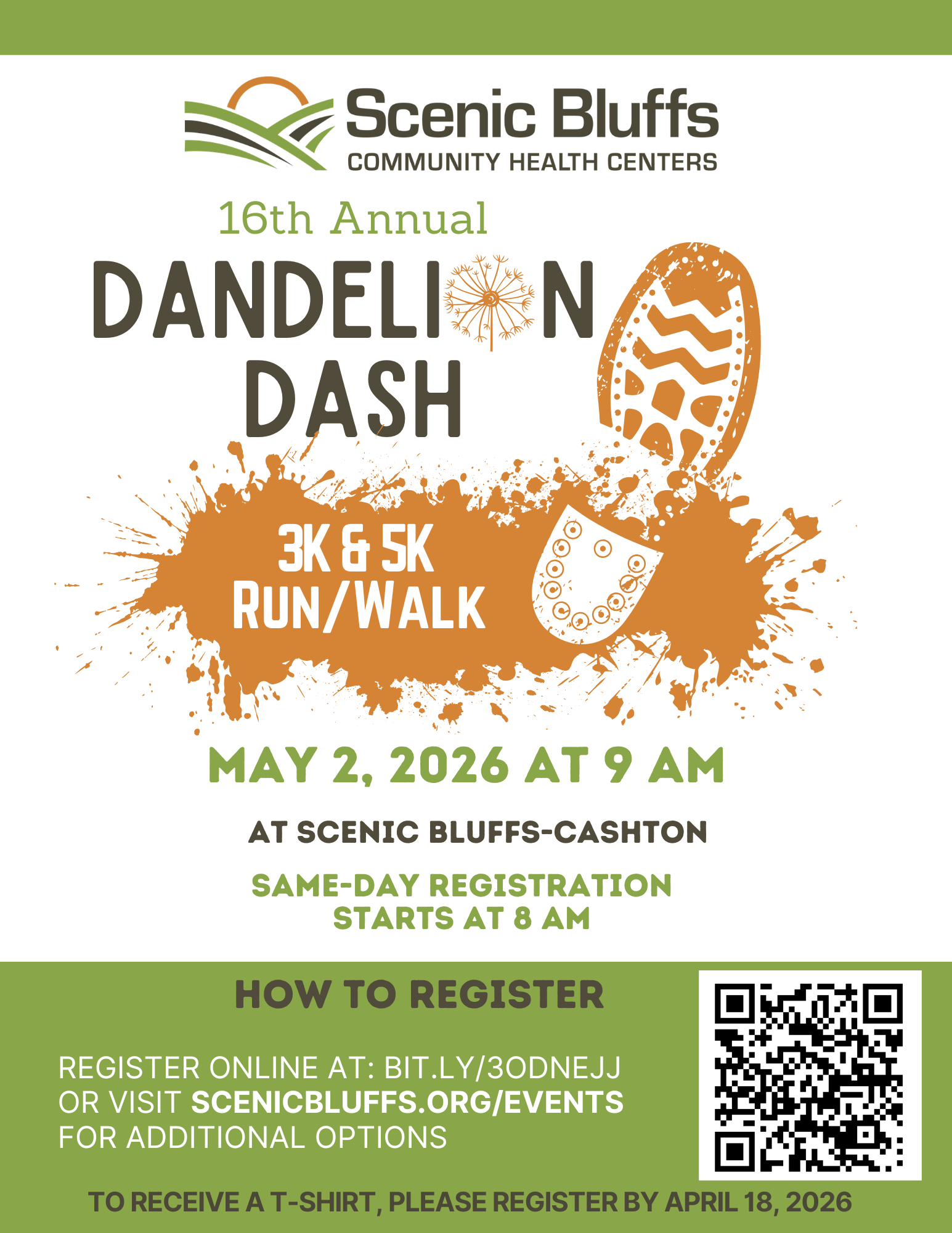To register for the Dandelion Dash, visit: events.ticketleap.com/tickets/scenicbluffs/Dash26 or pickup a registration form at any Scenic Bluffs location. Same-day registration will also be offered, beginning at 8 a.m. on May 2nd. Please register prior to April 18, 2026 to ensure your Dandelion Dash t-shirt.