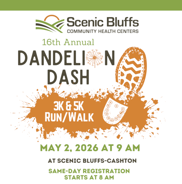 Join us for the 16th annual Dandelion Dash! The Dandelion Dash is an annual fun run/walk event sponsored by Scenic Bluffs Community Health Centers. This is a family-friendly event designed to promote health and wellness throughout the community. Participants have the option to complete a 3K or 5K run/walk.